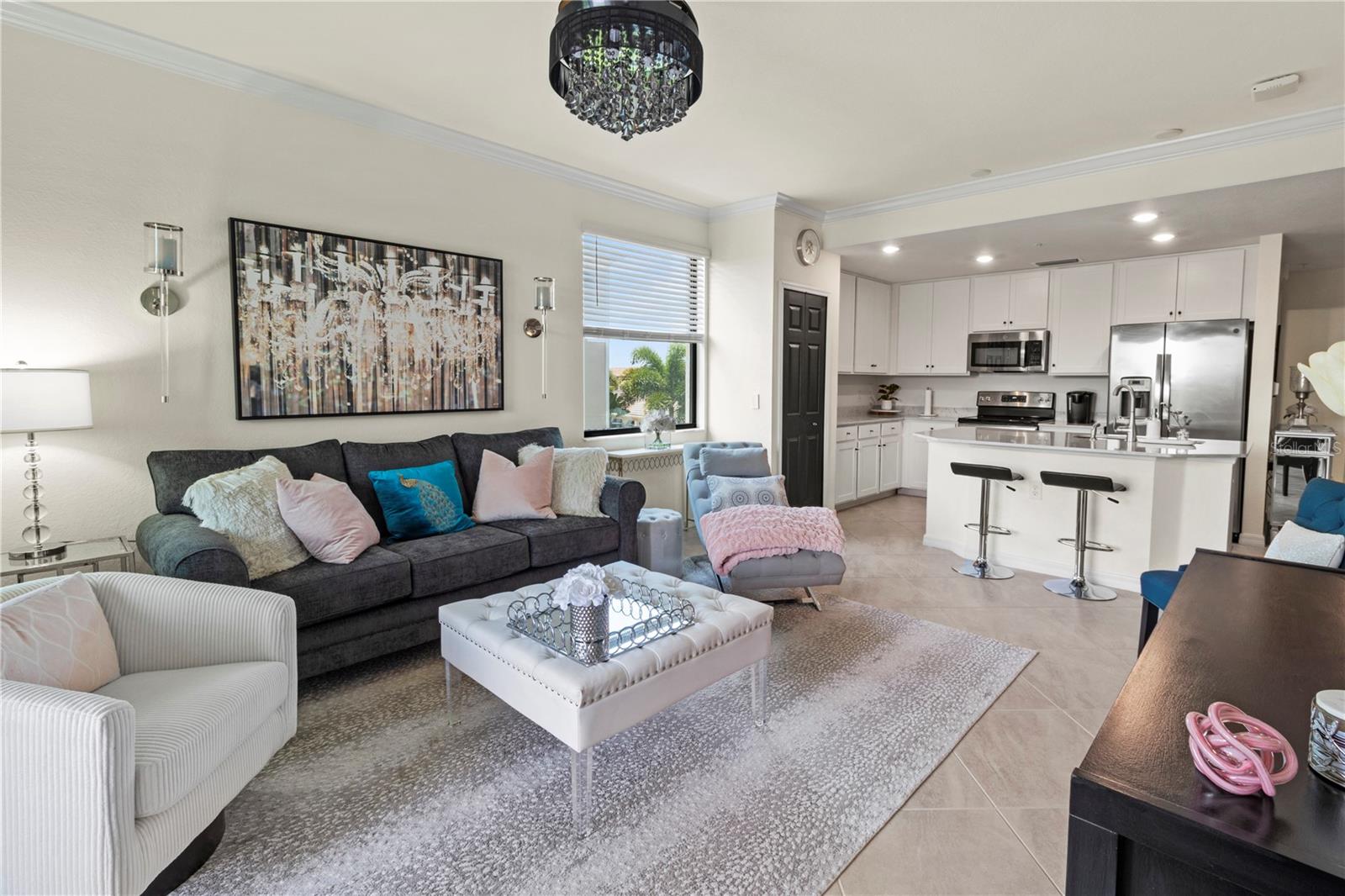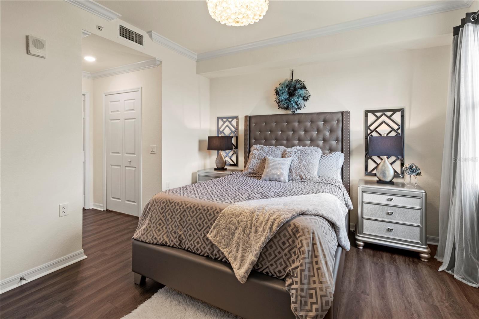 Bright, open-concept kitchen, dining and living with golf course and water views, Kitchen - Fully equipped, Quartz countertops, stainless appliances, Living room - Smart TV, fandelier. Master Suite - Queen bed, ensuite bath with step-in shower, two walk-in closets, fandelier, Smart TV. Guest Bedroom - Queen bed, adjacent full bath, ceiling fan. Den - Sleeper sofa bed, desk with Roku TV, printer. Lanai - Motorized sunshades, tiled flooring, outdoor ceiling fan. Laundry room - full size washer/dryer, built in cabinets. Upgraded luxury flooring in all bedrooms. Storage room with beach chairs/cart and room for golf equipment. Satellite pool directly beside condominium building. Ring doorbell with external security camera, front door smart locks. Covered designated parking. Elevator access. Includes High Speed Wi-Fi, full Spectrum TV package.