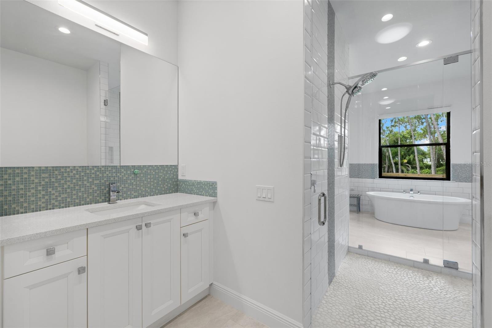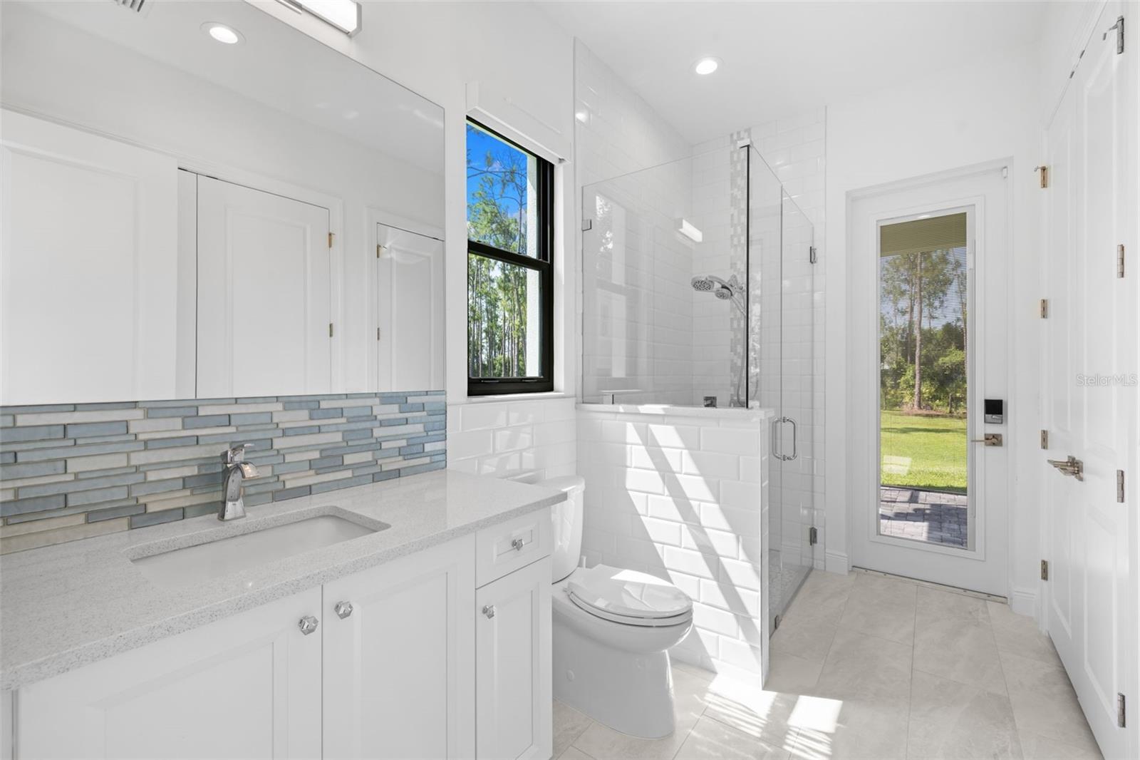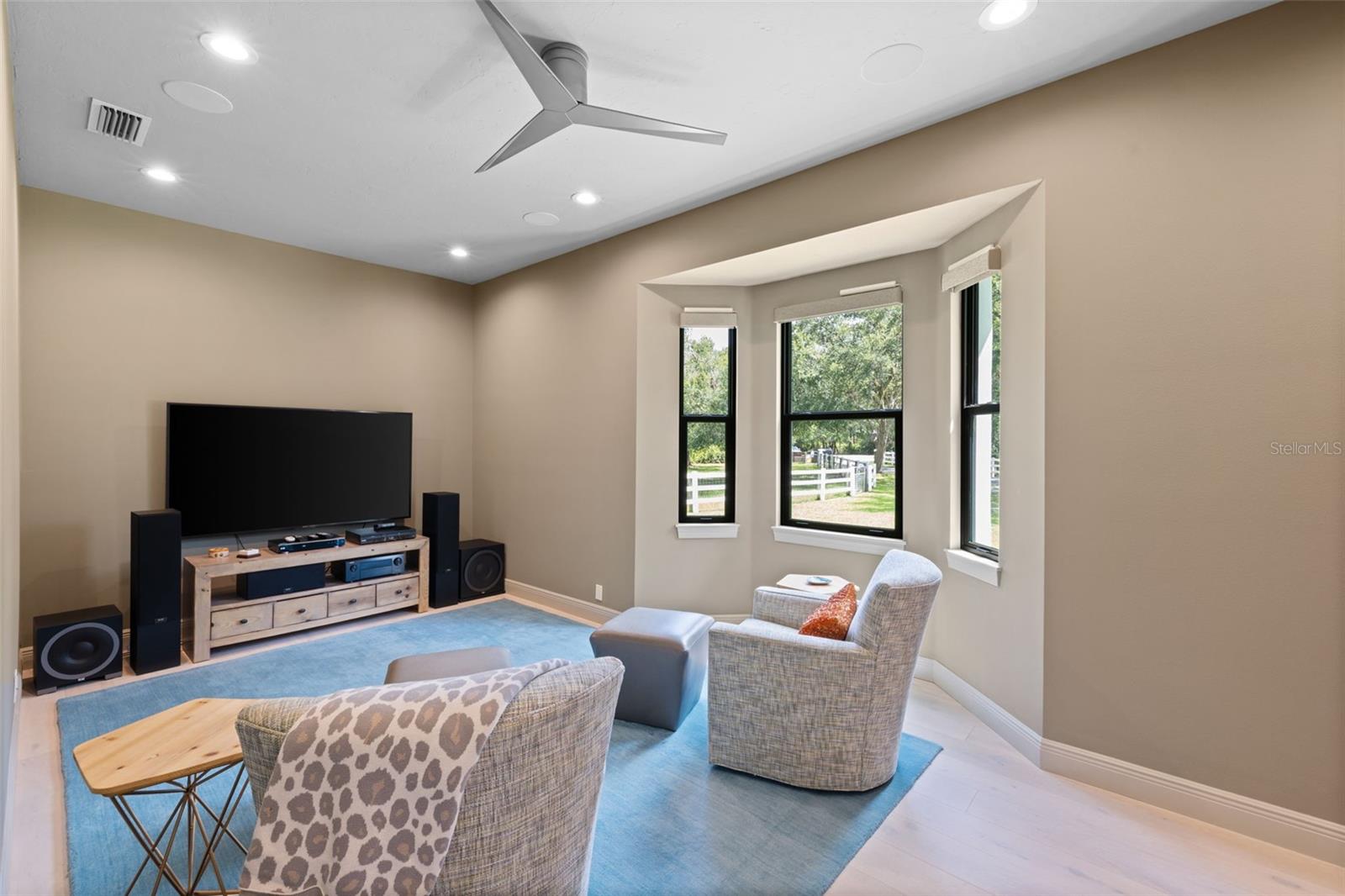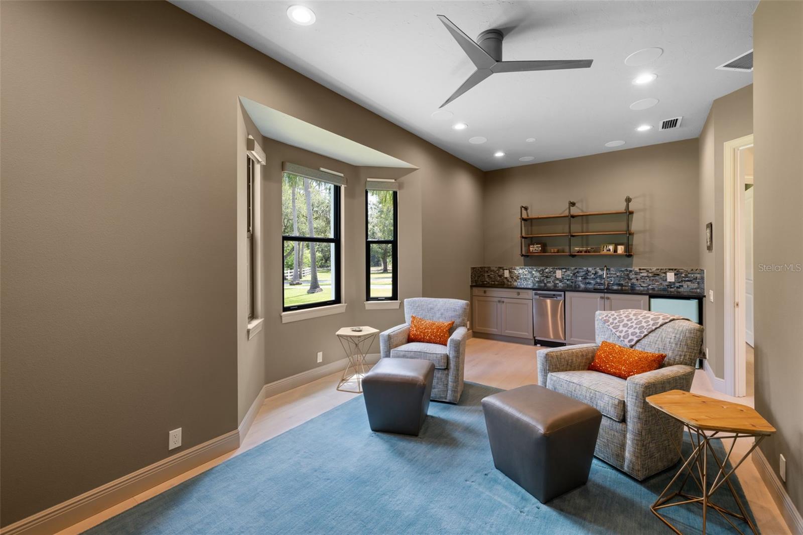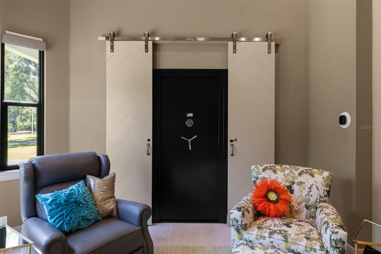The primary residence offers four bedrooms, three of which are en-suite, with one thoughtfully repurposed as a private office or den, discreetly housing an approximately 9x7 integrated safe room. The primary suite is a private sanctuary, featuring dual spa-inspired his-and-her bathrooms adjoined by a walk-through shower, a sculptural soaking tub, and an impressive walk-in California Closet that you'll never want to leave. Within the primary wing, a sophisticated media room awaits, complete with a wet bar featuring a sink, dishwasher, and mini fridge, making it the perfect space for entertaining or a quiet retreat.