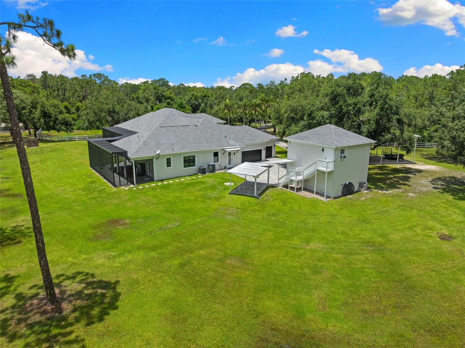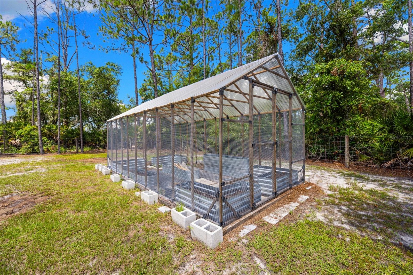 Beyond the main home, the estate offers five garage spaces, three of which are attached and two of which are detached. A one-bedroom, one-bath guest studio, elegantly positioned above the detached garage, is ready for your personal design. Outside, expansive covered lanais and a vast screened entertaining terrace overlook the cleared and well-maintained grounds, providing a breathtaking backdrop for watching neighborhood wildlife, sunsets, or simply enjoying the peace of your sanctuary. Just beyond the home is a charming greenhouse, ideal for cultivating orchids, tropical plants, or an organic garden; a peaceful, refined escape for the discerning horticulturist.